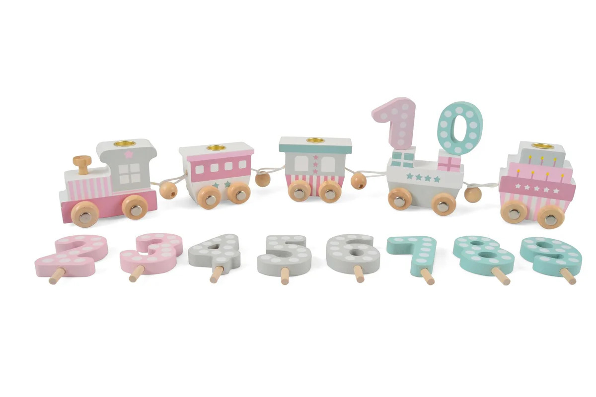 Ett födelsedagståg är en rolig grej för barnet att ha på födelsedagsbordet, så att han/hon kan sätta ett nytt nummer på tågets främre vagn varje år. Kan användas i många år framöver. Ett lok och 4 vagnar ingår. 40 cm. lång.